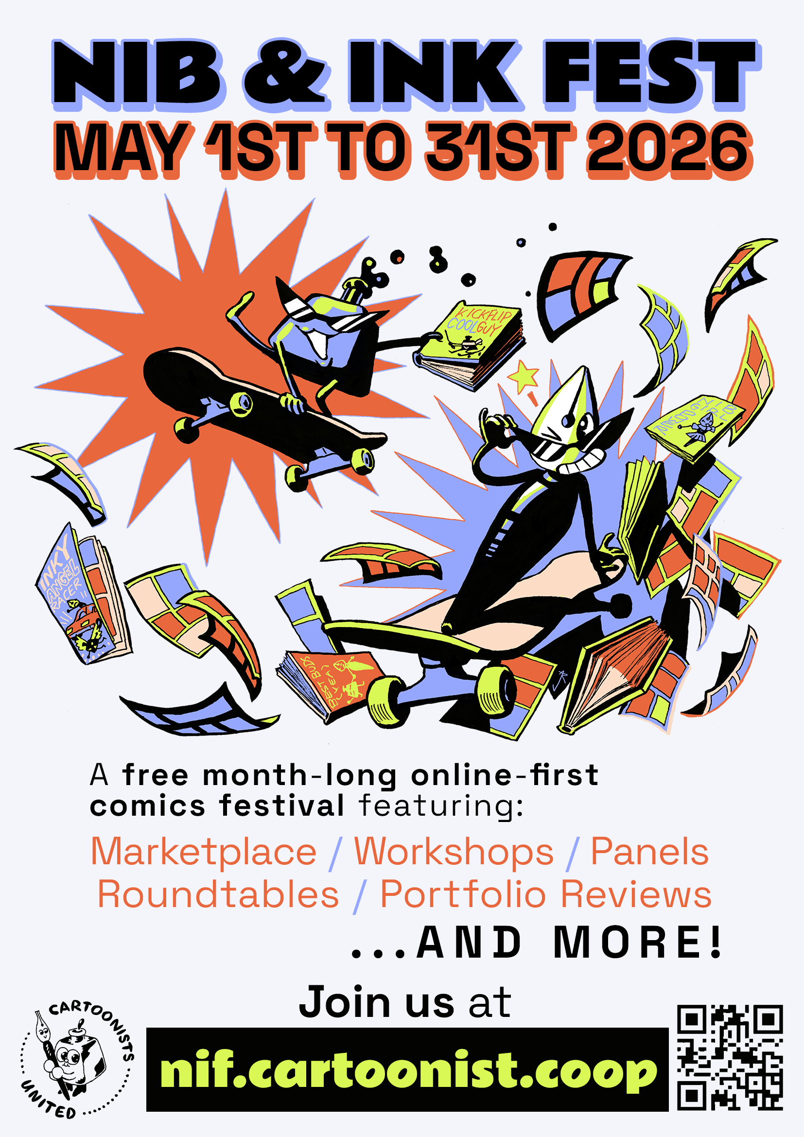 | What’s the Nib and Ink Fest (NIF), you ask? Why, it’s the Co-op’s very own month-long online comics fest held annually in May! It features a marketplace for digital comics created by our Cooperative members, along with free virtual events every weekend that month. It’s very cool, if we do say so ourselves. 😎 The Marketplace is curated by the NIF Committee organizers and includes comics for sale; a free Sampler featuring preview pages of webcomics that you can download; and a fundraiser zine called Oops All Comics! featuring all brand new, one-page comics created for this year’s theme of “Eureka!” You don’t wanna miss these awesome events and comics, so be sure to sign up for our NIF Mailing List to keep up-to-date with our next batch of comics, contributors, events, and more! |